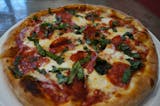 Mozzarella cheese, spicy Italian sopressata, fresh basil & extra virgin olive oil. Spicy.