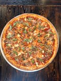Red sauce, mozzarella cheese, pepperoni, sausage, bell peppers, onions, mushrooms.