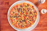 Pepperoni, meatballs, Italian sausage, black olives, mushrooms, garlic, red sauce.
