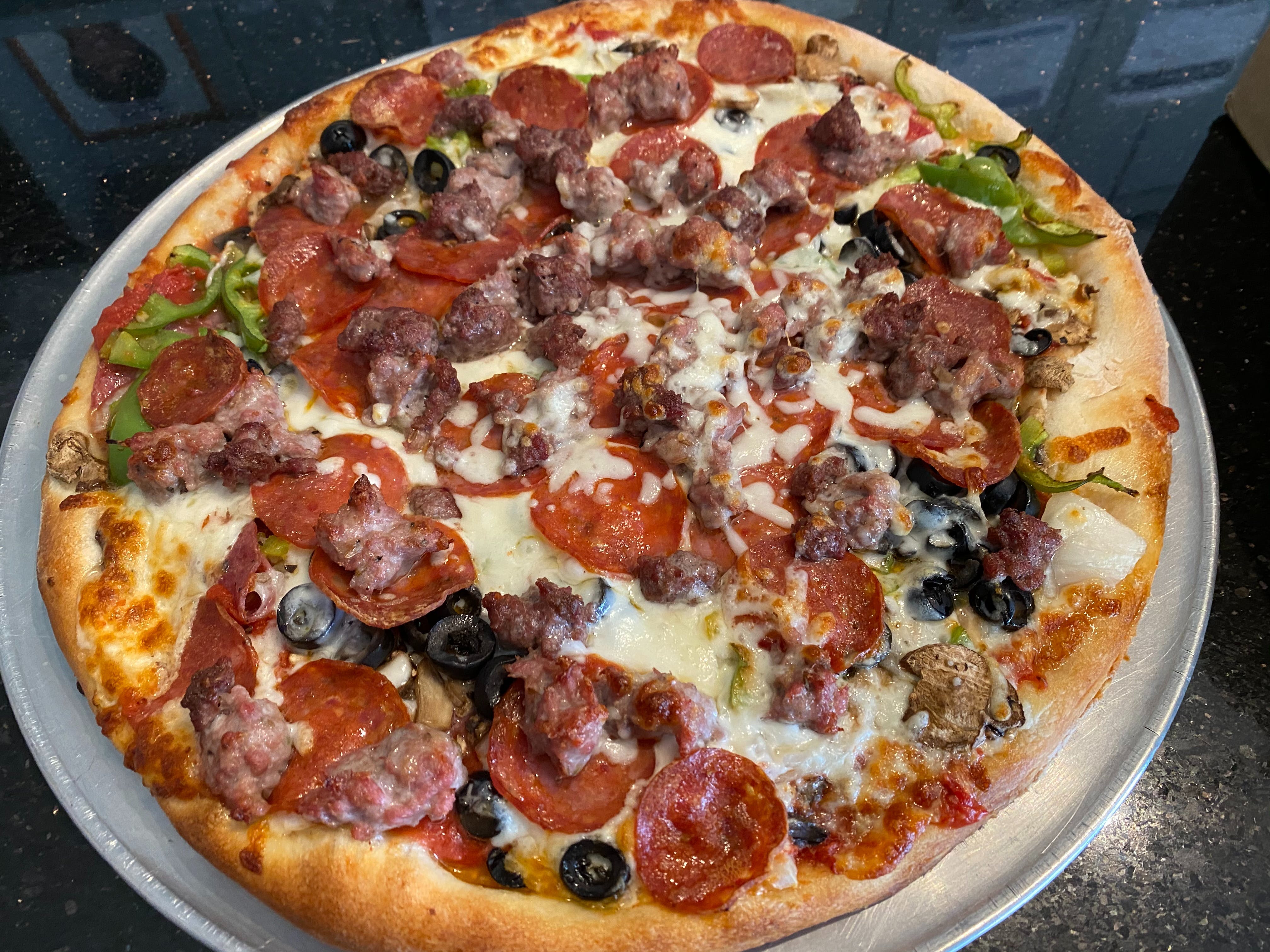 Pepperoni, sausage, salami, ground beef, olives, bell peppers, mushrooms & onions.
