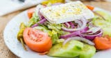 Tomatoes, cucumbers, pepperoncinis, Kalamata olives, red onions and feta on a bed of lettuce.