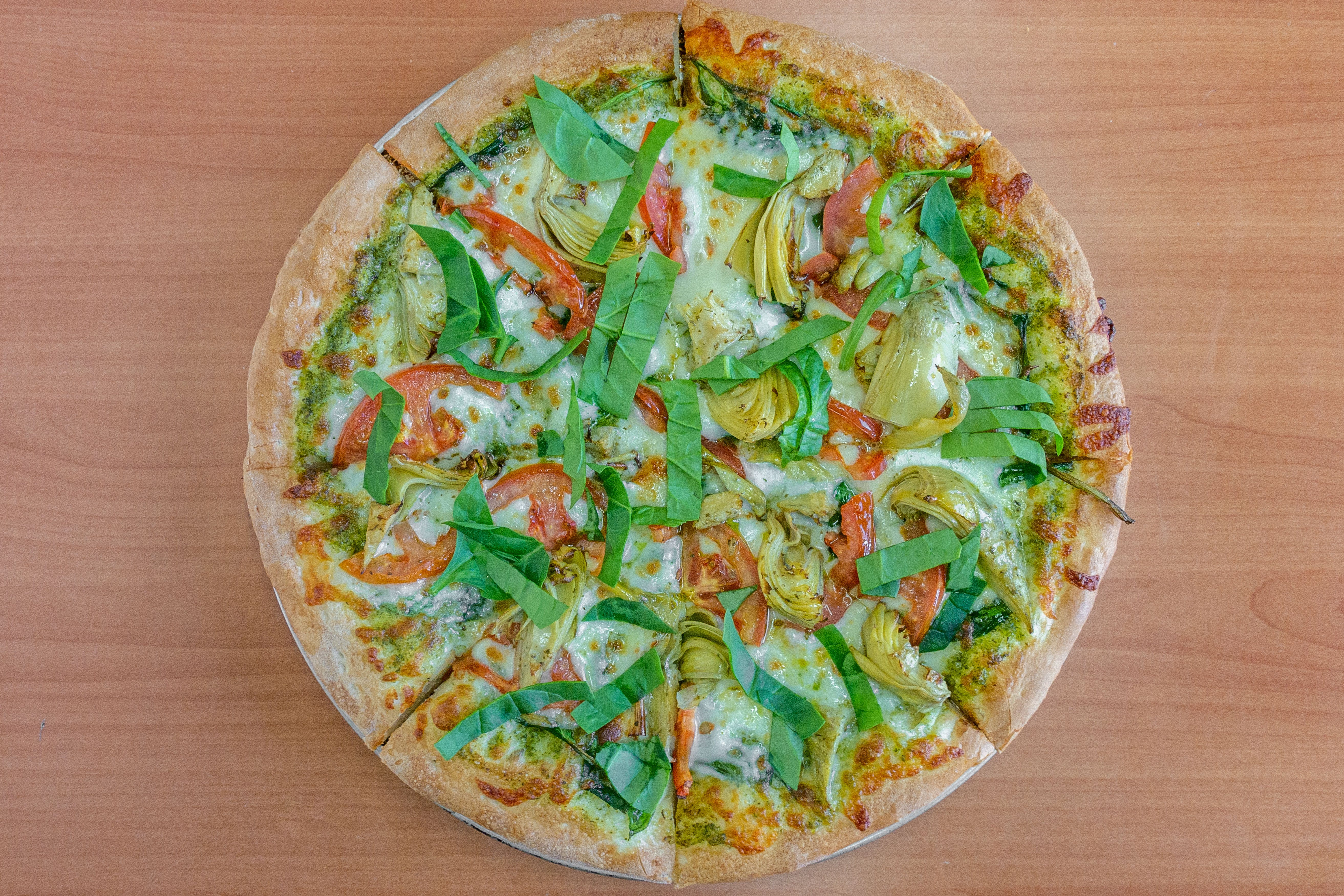 Pesto sauce, mozzarella cheese, spinach, artichoke hearts, roma tomatoes.