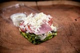Cut into 4 pieces. Cheese and salsa. Includes guacamole, sour cream, lettuce, tomato.