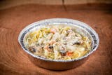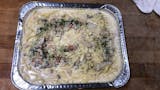 Alfredo sauce, Parmesan cheese, chicken, mushrooms, garlic, tomatoes.