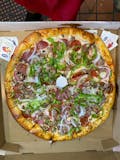 Salami, pepperoni, mushrooms, onions, bell peppers, sausage.