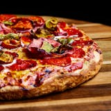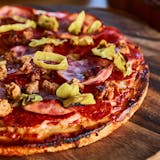 Pepperoni, Canadian bacon, sausage, pepperoncini all over super stretchy melted mozzarella. 12" medium size pizza. Feeds 1-2 people. All pizzas are made with Mongiello's thick, light, and crispy crust.