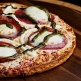 Sliced salami, rich ricotta, sliced olivine mozzarella and drizzled with our fresh homemade pesto on top of our robust red sauce and mozzarella cheese.