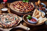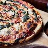 Rich ricotta cheese, buffalo milk mozzarella and drizzled with our fresh homemade pesto on top of our robust slow rise italian pizza crust.