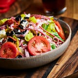 Fresh romaine lettuce, pepperoni, salami, ham, olives, tomatoes, and thinly sliced onions & pepperoncini topped with fresh mozzarella and Italian dressing.