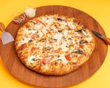 Garden fresh goodness, hot from the oven! Tomato sauce, spinach, abundant cheese, mushrooms, onions, peppers, olives, tomatoes.