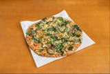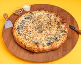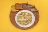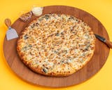 A creamy, dreamy delight that sizzles! Rich white sauce, ample cheese, chicken, mushrooms, spinach, garlic, parmesan.
