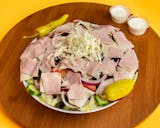 The Sizzling pizza's signature mix! Lettuce, tomatoes, cucumbers, peppers, onions, olives, turkey, ham, cheese.