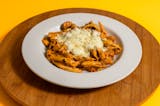 Penne pasta, chicken breast, mushrooms, garlic, fresh tomatoes in tomato cream sauce.