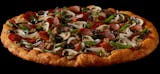 Pepperoni, Italian sausage, salami, linguica, mushrooms, green peppers, yellow onions, black olives on zesty red sauce (Anchovies on request).