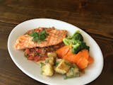 Grilled scottish salmon on a bed of lentils. Served with broccoli, carrots and roasted rosemary potatoes.