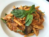 Vegetarian. Penne with sauteed eggplant, tomato sauce, and melted mozzarella.
