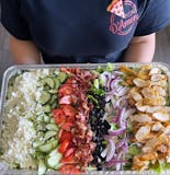 Fresh lettuce, tomatoes, green peppers, red onions, cucumbers & black olives. Supersized for your party.