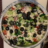 Whether you are planning a small gathering or an office party this is healthy delicious option. Chopped Romaine and iceberg lettuce, fresh chopped tomatoes, chopped red onions, black olives, chopped cucumbers, and finished with delicious feta cheese. This salad serves 20 people. Ask for your favorite dressing or we can send you a variety of dressings (balsamic vinaigrette, ranch and Italian)