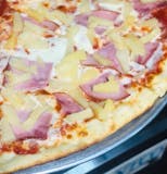 This pie is just the right amount of sweet. Thin crust topped with our homemade pizza sauce, mozzarella cheese, pineapple and ham.