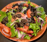 Romaine, iceberg, black olives, tomatoes, red onions, cucumbers, feta cheese.