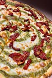 Thin crust pizza topped with ricotta cheese, mozzarella cheese, sun-dried tomatoes and pesto sauce. This pizza has no pizza sauce.