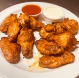 Never fried, always baked to crisp. Choose from a variety of flavors on instructions ( bbq, original buffalo, honey garlic, mango habanero and honey garlic) one flavor per order. Served with a side of ranch.