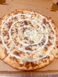 If you are looking for a light and buttery pie, this is it. Hand crafted pie topped with an abundant amount of cheese and a drizzle of pizza sauce on top.