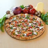 Gluten free crust, red tomato sauce, vegan cheese (daiya), red onion, green bell pepper, mushroom, black olive, tomato, and artichoke.