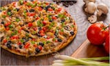 Garlic chicken combination. Grilled chicken, diced tomatoes, olives, mushrooms, and green onions on classic red sauce.