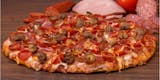 All meat combo. Mounds of italian sausage, pepperoni, beef, salami, linguica and ham on classic red sauce.