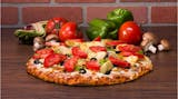 A vegetarian landmark! Loads of mushrooms, black olives, bell peppers, artichoke hearts, and sliced fresh tomatoes on classic red sauce.