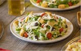 Garlic chicken combination. Grilled chicken, diced tomatoes, olives, mushrooms, and green onions on white creamy garlic sauce.