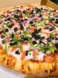 Ham, pepperoni, bacon, sausage, mushrooms, bell pepper, red onions, black olives, ham & mozzarella cheese, pizza sauce.