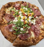 Prosciutto arugula, small center salad, corn tomatoes, fresh mozzarella arugula & raspberry vinaigrette, garlic olive oil sauce, mozzarella cheese.