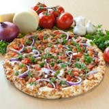 Grilled chicken breast, BBQ sauce, jalapenos, red onions, melted cheese.