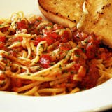 A plate of spaghetti with rich marinara sauce, topped with parmesan cheese and a side of garlic bread.