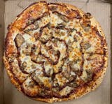 Pepperoni, Italian sausage, ham, beef, breakfast bacon, mozzarella cheese, crust on top
