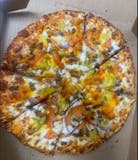 Pepperoni, Italian sausage, ham, breakfast bacon, red onion, green pepper, mushrooms, black olives, green olives, tomato, artichoke heart, sundried tomatoes.