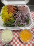 Chicken, black olives, feta, onions, tomatoes, pepperoncini & Greek dressing.