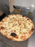 White pizza, ricotta, bacon, grated parmesan cheese, garlic.