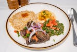 Vegetarian. Served over rice with hummus and tabouli salad.