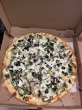 White pizza with spinach, feta cheese, garlic, olives, and mozzarella.