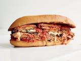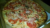 Ground beef, bacon, cheddar and mozzarella with special tomato sauce.