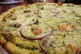 White pizza with mozzarella cheese, fresh garlic, Parmesan cheese, oregano, basil and fresh tomatoes.