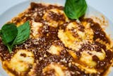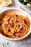 Fresh plum tomato sauce simmered with spices, garlic and fresh basil. Served with salad and dinner rolls.