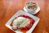 Chicken cutlet topped with tomato sauce and mozzarella cheese.
