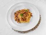 Spaghetti with Bolognese sauce crafted from a blend of pork and beef, topped with shaved Parmesan.