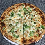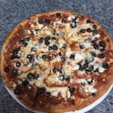 Onions, peppers, mushrooms & mozzarella with your choice of red or white sauce.