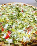 Fresh chicken strips with pesto sauce, diced tomatoes and mozzarella.