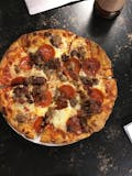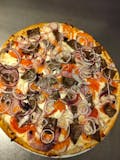 Pepperoni, onion, peppers, mushroom, sausage, bacon.